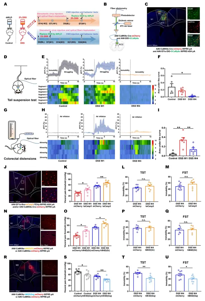 作者通过钙成像记录将 ACCGlu 神经元活动与内脏超敏反应和抑郁样行为直接联系起来,并尝试使用AAV病毒工具损毁ACC中的谷氨酸能神经元。与注射mCherry病毒的对照组相比,表达taCasp3的小鼠在炎症期(DSS W1)或缓解期(DSS W4)内脏痛阈值增加,但对缓解期的抑郁样行为没有显着改善。通过化学遗传学技术,CNO注射后,抑制 ACCGlu 神经元可减轻内脏超敏反应,但不会减轻抑郁样行为。激活 ACCGlu 神经元会加剧小鼠的内脏疼痛,但其抑郁症状得到了明显改善(图2)。这些发现表明, ACCGlu 神经元直接参与调节内脏敏感性和抑郁样行为。