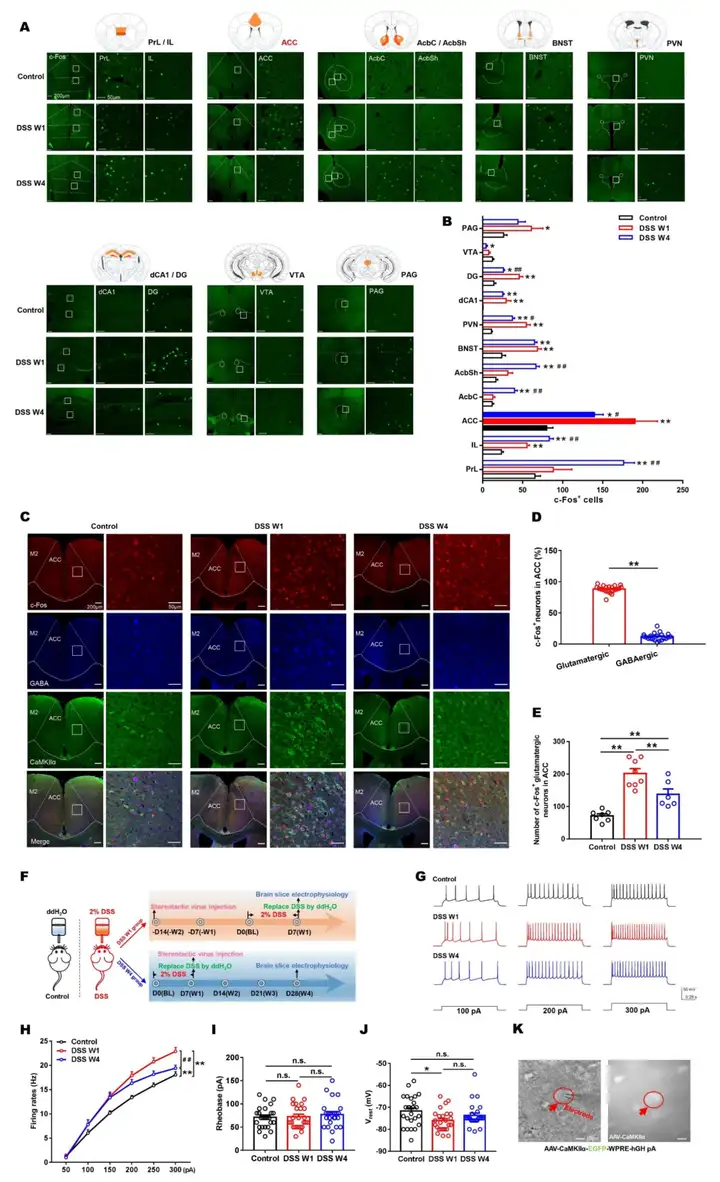 行为学测试后,免疫荧光的全脑筛查结果显示,结肠炎小鼠多个脑区的c-Fos蛋白表达增加,包括内侧前额叶皮质(mPFC)、伏隔核(Acb)、终纹床核(BNST)、下丘脑室旁核(PVN)、海马、腹侧被盖区(VTA)、中央导水管周围灰质区(PAG)和前扣带皮层(ACC)。根据以往对ACC功能的研究,作者选择了与疼痛和情绪调控相关的ACC脑区。CaMKIIα和c-Fos的荧光共标结果提示,DSS(葡聚糖硫酸钠)暴露后锥体神经元活化的数量显著增加,尤其是在DSS W1组。通过电生理膜片钳技术直接记录ACC锥体神经元的放电活动,结果发现DSS暴露后ACCGlu神经元放电频率明显增强(图1)。以上研究表明,急性结肠炎后伴有内脏超敏反应小鼠的ACC中锥体神经元活性升高。