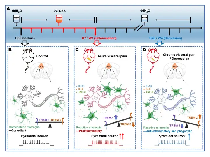 炎症性肠病(Inflammatory bowel disease, IBD)是一种具有高复发率的慢性疾病。迄今为止,针对IBD的临床治疗主要集中在炎症和消化道症状本身,而忽视了其伴随的内脏疼痛,焦虑、抑郁等情绪症状。越来越多的证据表明,肠道和大脑之间的双向交流在IBD及其并发症的病理生理学中发挥不可或缺的作用,但迄今为止,结肠炎后内脏疼痛和抑郁症的中枢免疫机制尚不明确。