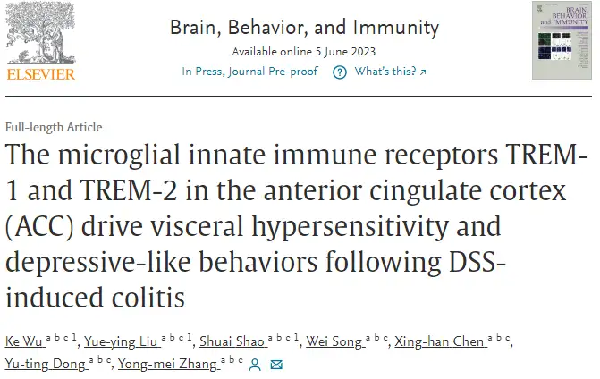 2023年6月5日,徐州医科大学麻醉学院张咏梅教授课题组在Brain Behavior and Immunity(IF=19.227)期刊在线发表了题为“The Microglial Innate Immune Receptors TREM-1 and TREM-2 in the Anterior Cingulate Cortex(ACC)Drive Visceral Hypersensitivity and Depressive-like Behaviors Following DSS-induced Colitis”的研究论文。徐州医科大学麻醉学院博士生吴可为论文的第一作者,博士生柳月影和硕士生邵帅为论文的共同第一作者,张咏梅教授为论文的通讯作者。在这项工作中,研究人员通过小鼠建立了急性结肠炎的动物模型,结合行为学、电生理膜片钳、光遗传、化学遗传等方法,揭示了前扣带皮层(ACC)中小胶质细胞固有免疫受体TREM-1和TREM-2(髓系细胞表达的触发受体-1/2,The triggering receptors expressed on myeloid cells-1/2)的表达失衡是导致急性结肠炎后内脏超敏反应和抑郁样行为发生发展的关键因素,TREM-1/2受体将成为预防和解决炎症性肠病伴发内脏疼痛和抑郁症的可靠治疗靶点。该项工作得到了科技部STI2030-重大项目(2021ZD0203100),国家自然科学基金项目(No. 82271257; No. 82071228),青蓝工程等的资助。