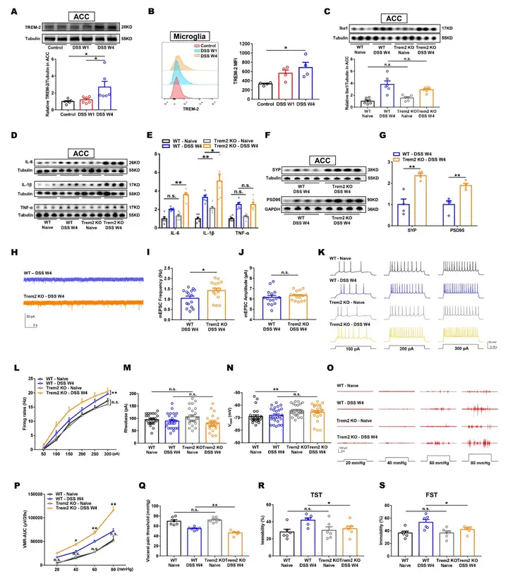 为了探究ACC中TREM-2是否与DSS诱导的结肠炎伴发的抑郁症状相关,作者使用WB分析和流式细胞术检测了TREM-2的表达情况。尽管Trem2 KO和WT小鼠在结肠炎的缓解期表现出相似的Iba1表达,但TREM-2的下调增加了炎症因子的表达和突触连接水平,这可能是由于TREM-2驱动的发挥吞噬和抗炎功能的小胶质细胞比例下降所致。在DSS暴露后第4周,Trem2 KO小鼠的 ACCGlu 神经元放电率增加,加重了内脏疼痛,但抑郁症状得到明显改善(图5)。这些发现提供的证据表明,ACC中小胶质细胞TREM-2可能在结肠炎缓解阶段参与调节内脏痛觉敏感性和抑郁样行为。