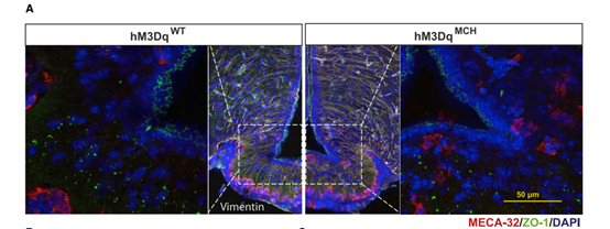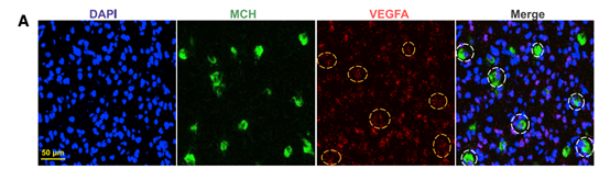 而在之前的研究表明VEGF信号参与调控ME的屏障。因此研究人员猜测可能是ME脑区中VEGF信号通路介导了MCH神经元调控ME的屏障。免疫荧光实验发现MCH神经元与VEGF标记物存在共标,表明MCH神经元可分泌VEGF。此外给与VEGF受体的阻断剂后即便慢性激活MCH神经元并不能增加瘦素的敏感性。