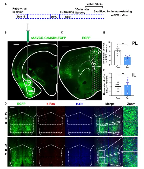 接着,课题组探究了麻醉和手术是否影响mPFC-杏仁核投射神经元活性,免疫荧光结果发现麻醉和手术在记忆的巩固阶段降低了PLGlu-BLA投射神经元活性(图3)。