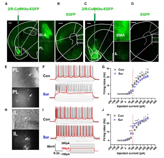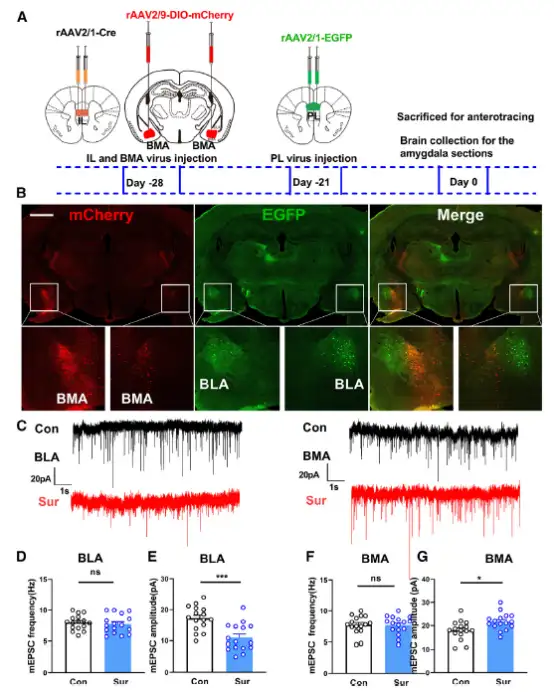 图5. 正向病毒示踪再次确认PL-BLA投射和IL-BMA的投射,麻醉和手术影响投射的突触后电流,BLA神经元mEPSC降低,BMA神经元mEPSC升高。
