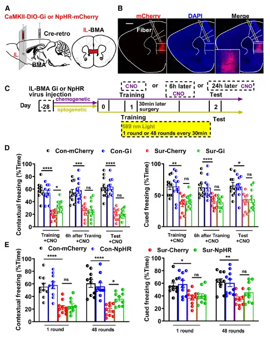 基于以上环路基础,课题组应用光遗传和化学遗传调控,揭示了麻醉和手术导致PLGlu-BLA环路活性降低,手术发生在记忆完全巩固之前,可能会损害记忆。如果在巩固阶段应用光遗传激活PLGlu-BLA环路,则能够部分地挽救恐惧记忆。麻醉和手术导致ILGlu-BMA环路激活,进而促进恐惧记忆的消退。如果在巩固阶段应用光遗传抑制ILGlu-BMA环路,则能够部分地挽救恐惧记忆(图6-7)。