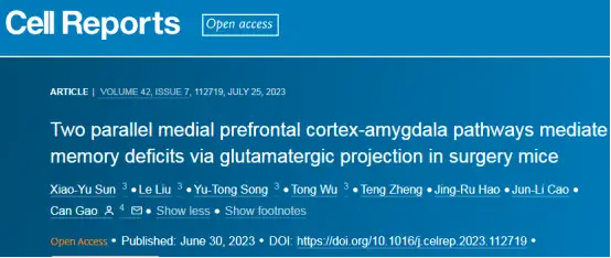 2023年6月30日,徐州医科大学麻醉与镇痛应用重点实验室高灿教授课题组在Cell Press(细胞出版社)旗下期刊Cell Reports发表论文“Two parallel medial prefrontal cortex-amygdala pathaways mediate memory deficits via glutamatergic projection in surgery mice”。该论文揭示了两条平行的mPFC-Amy环路介导手术小鼠记忆缺陷的环路机制。徐州医科大学博士,上海交通大学医学院附属仁济医院麻醉科医师孙晓玉、徐州医科大学博士研究生刘乐、徐州医科大学硕士研究生宋雨桐、徐州医科大学博士吴桐为论文共同第一作者。徐州医科大学高灿教授为通讯作者。该研究得到了国家自然科学基金面上项目、国家科技创新2030重大项目、江苏省自然科学基金、江苏省高等学校自然科学基金、江苏省青蓝工程和中国博士后基金面上项目等项目的资助。本研究得到了曹君利教授的大力支持。