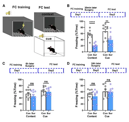 图1. 麻醉和手术损伤小鼠恐惧记忆。A. 条件性恐惧记忆模式。B. 在训练后30分钟进行麻醉和手术,小鼠的恐惧记忆受损。C-D. 在训练后6小时和24小时进行麻醉和手术,小鼠的恐惧记忆无明显损伤。