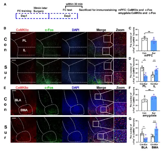 既往研究表明,前额叶皮质和杏仁核在恐惧记忆中发挥重要作用,手术和麻醉是否通过影响前额叶皮质和杏仁核进一步导致学习记忆功能受损?免疫荧光结果显示:麻醉及手术减少了c-Fos在PL(前边缘皮层)和BLA(基底外侧杏仁核)脑区谷氨酸能神经元中的表达,但是IL(边缘下区)和BMA(基底内侧杏仁核)脑区谷氨酸能神经元中c-Fos表达增多(图2)。