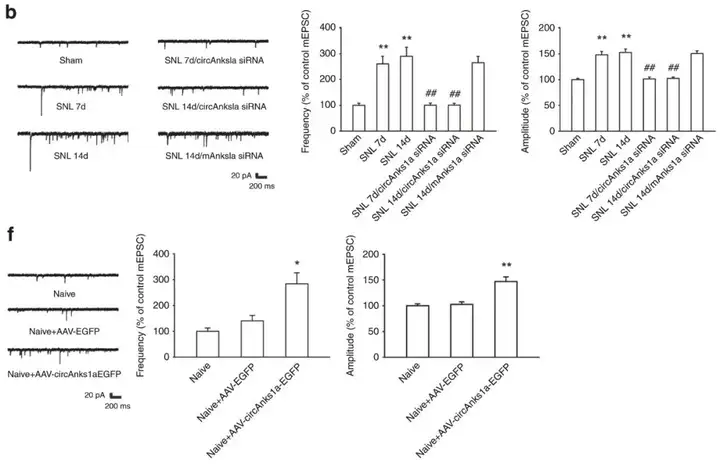 神经损伤(SNL,脊神经结扎)后第7天(SNL 7d)、第14天(SNL 14d)脊髓切片的电生理研究表明NK1R阳性神经元(circAnks1a阳性细胞)中微小兴奋性突触后电流(mEPSC)的频率和幅度显著增加。而由于鞘内注射circAnks1a siRNA对circAncs1a的抑制作用,造成SNL 7d、14d诱导的mEPSC幅度和频率的增加减少。另一方面在naive小鼠中经椎管将AAV-hSyn-circAnks1a-nEF1α-EGFP注射到L4-L6脊髓节段以在脊髓背角过表达circAnks1a,结果显示mEPSC的幅度和频率增加。总的来说,这些结果表明脊髓circAnks1a促进中枢敏化。