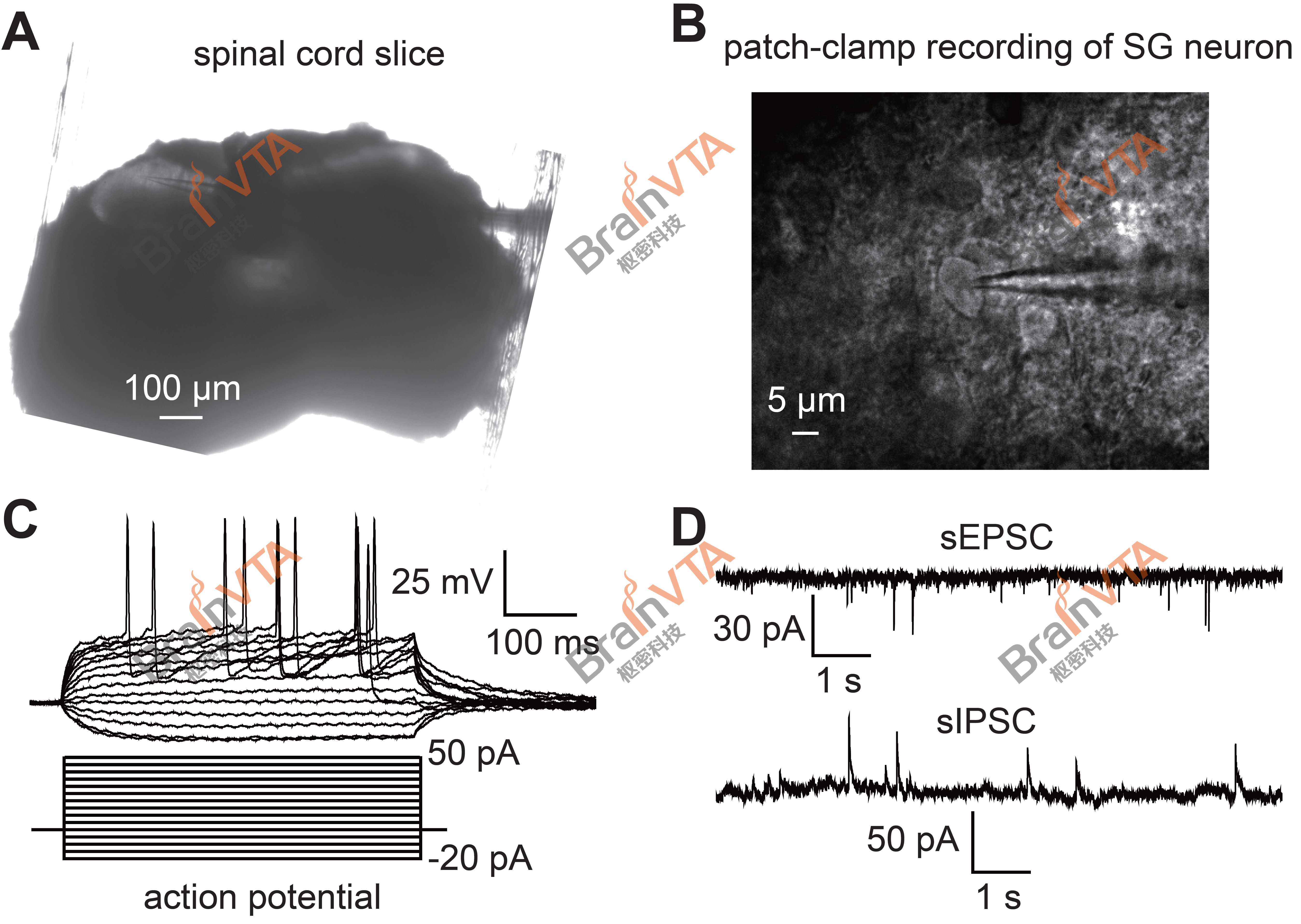 图4. 全细胞记录脊髓背根神经节神经元电活动。(A)脊髓切片(250 µm)。(B)胶状质(SG)区神经元膜片钳记录代表图。(C)全细胞记录动作电位。(D)全细胞记录自发兴奋性突触后电流(sEPSC,上)和自发抑制性突触后电流(sIPSC,下)。