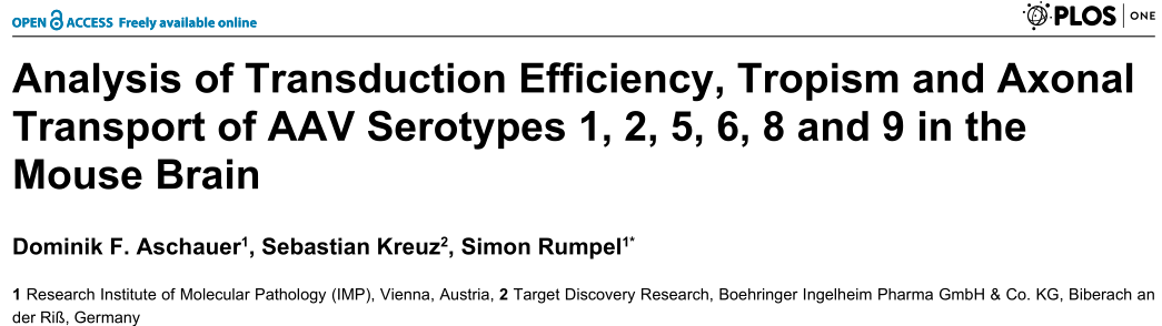 病毒载体相比于质粒载体具有得天独厚的优势,如利用病毒天然的感染性进入细胞,感染效率高;病毒的宿主范围广,可以感染分裂细胞和非分裂细胞;病毒基因组结构简单、分子背景比较清楚,稳定易于改造、易于制备;不同的病毒载体具有不同的表达特点;通过载体改造的方式形成了复制缺陷型结构,安全性高;病毒包装技术经历了多年的研究,已趋于成熟,可用于产业化大量生产等。而腺相关病毒(AAV)载体更是病毒载体中的「明星」,因其低免疫原性,可感染多种组织细胞,可介导外源基因长期稳定表达,极低基因组整合概率,已成为最佳载体。那么,AAV 载体在使用时应该如何选择呢?这就需要了解清楚 AAV 不同血清型的表达特性,因此,小编在这里给大家推荐奥地利维也纳分子病理学研究所 Simon Rumpel 带领实验团队发表的文章「Analysis of Transduction Efficiency, Tropism and Axonal Transport of AAV Serotypes 1, 2, 5, 6, 8 and 9 in the Mouse Brain」,该文详细解析了不同血清型的 rAAV 载体在中枢系统不同脑区、不同类型细胞中的表达特点,并通过与 LPS(脂多糖)诱导的小胶质细胞激活比较发现 rAAV 载体注射后并不会引起中枢的免疫应答,同时揭示了 rAAV5 载体在内嗅皮层到齿状回兴奋性神经元投射的逆轴突运输,以及探究了双链 rAAV 载体的表达时间特性。