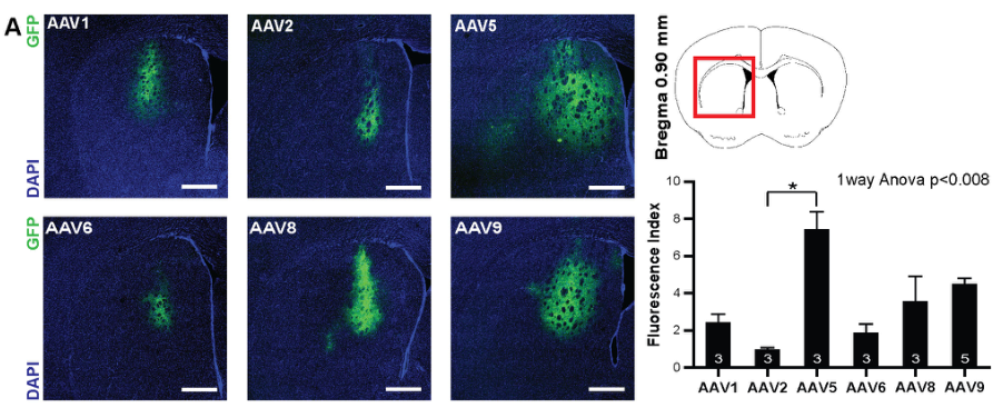 研究人员将不同血清型 AAV 注射到不同脑区,21 天后通过检测绿色荧光蛋白(GFP)表达比较不同血清型在纹状体、海马和听觉皮层的表达效率。在分析的脑区中,rAAV5、8 和 9 在不同脑区的表达效率具有相似性,且显示出良好的表达水平,而 rAAV2 在所有脑区中均表达最低。rAAV 在不同脑区表达效率的排名如下:纹状体:AAV5>AAV9>AAV8>AAV1>AAV6>AAV2;海马:AAV9>AAV5>AAV8>AAV1>AAV6>AAV2;听觉皮质:AAV9>AAV8>AAV6>AAV5>AAV1>AAV2。