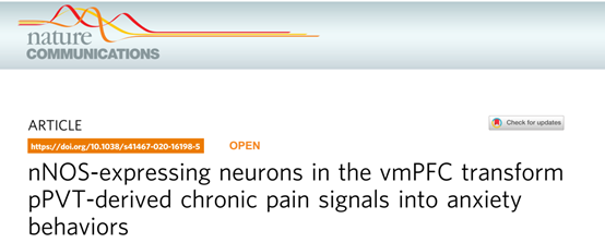 2020年5月18日南京医科大学药学院罗春霞教授在Nature Communications杂志上发表文章揭示了丘脑室旁核的尾部(pPVT)兴奋性神经元通过激活表达vmPFC脑区表达神经元来源的一氧化氮合酶(nNOS)的神经元来驱动慢性疼痛引起的焦虑(3)。