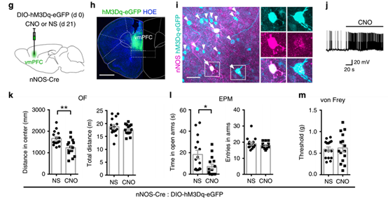 研究人员向小鼠注射CFA(Freund’s adjuvant)3天后机械痛觉过敏并引起焦虑样行为,可以持续20天,表明慢性疼痛伴随焦虑症状模型成功。免疫荧光实验发现上述慢性疼痛模型小鼠的vmPFC脑区激活的神经元大量表达nNOS,通过向nNOS-cre小鼠的vmPFC脑区注射化学遗传学病毒特异性激活nNOS神经元后表现出焦虑样行为。