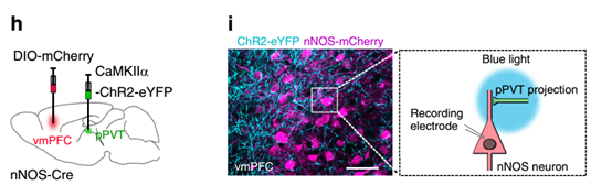 pPVT投射到vmPFC的兴奋性输入是否激活vmPFC脑区nNOS的神经元,并将信号从疼痛转变为焦虑。研究人员采用双病毒策略向nNOS-cre小鼠pPVT注射表达兴奋性神经元启动子的光遗传学病毒,在vmPFC注射AAV-DIO病毒,结果发现pPVT的兴奋性输入“围绕”nNOS的神经元,此外体外电生理实验记录发现pPVT光激活后可诱发vmPFC脑区nNOS神经元的谷氨酸能兴奋性突触后电流。