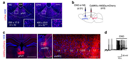 为了能够实现特异性慢性激活pPVT-vmPFC的神经环路,研究人员向pPVT脑区注射化学遗传学病毒后在vmPFC脑区注射CNO后不仅能够引起焦虑样行为,还引起机械和热痛觉过敏,类似于慢性注射CFA的效果。此外,慢性抑制pPVT-vmPFC的神经环路后可明显缓解慢性注射CFA引起的疼痛和焦虑样行为。