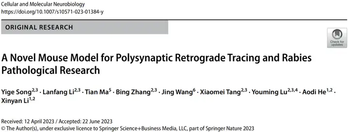 2023年7月5日,华中科技大学同济医学院基础医学院人体解剖学系李鑫焱教授和何奥迪教授联合在Cellular and Molecular Neurobiologys期刊在线发表了题为“A Novel Mouse Model for Polysynaptic Retrograde Tracing and Rabies Pathological Research”的研究论文。在这项工作中,研究人员构建了一个新的转基因小鼠,即GT小鼠,G和TVA均在全身表达。利用该小鼠模型,结合SAD-B19株RABV-EnvA-ΔG时,能实现逆行跨多突触示踪,并且动物毒性低,标记效率高;而GT小鼠感染CVS-N2c株RABV-EnvA-ΔG时,表现出与狂犬病相同的病程。因此,GT小鼠是多突触追踪和狂犬病病理学研究两用的安全模型。