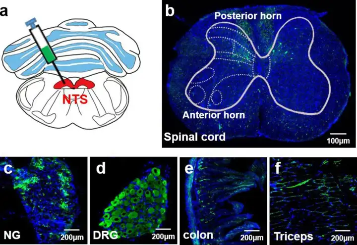 图3.GT小鼠从中枢到外周神经系统的逆行跨多突触追踪