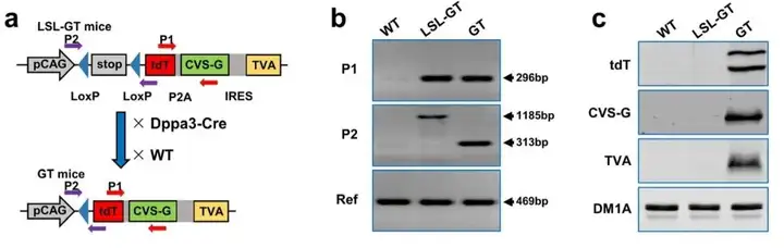 为使小鼠全身表达G和TVA,作者首先构建了CRE依赖表达G和TVA的小鼠,即LSL-GT小鼠(Rosa26-pCAG-LoxP-stop-LoxP-tdTomato-P2A-G-IRES-TVA)。随后LSL-GT小鼠先与Dppa3-IRES-Cre(生殖细胞中表达Cre重组酶)小鼠杂交,以删除LoxP-stop-LoxP(LSL)表达盒,再与野生型(WT)小鼠回交,成功得到G和TVA在全身无条件表达的GT小鼠。