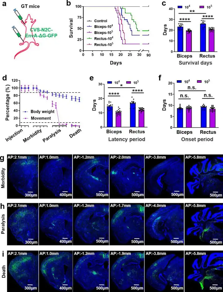 因为RABV-EnvA-ΔG-GFP可以感染GT小鼠并像野生型RABV那样向神经系统传播。因此,作者推测GT小鼠也可作为狂犬病病理学研究的模型。为验证假设,研究人员选用另一种成熟的逆行跨单突触示踪剂RABV的CVS-N2c株。与SAD-B19株相比,CVS-N2c株感染表现出较低的神经元毒性,但动物毒性显著,引起典型的狂犬病症状和死亡。研究人员将CVS-N2c-EnvA-ΔG-GFP病毒注入GT小鼠的肱二头肌或股直肌以模拟狂犬病病毒在四肢的自然感染,对照组WT小鼠的肱二头肌注射同种病毒。据报道CVS-N2c株在小鼠中引起麻痹样综合征,于是,感染后90天内每12小时记录每只小鼠的相关生理参数(体重、运动活性和存活率),结果与预期一致,仅GT组小鼠出现死亡,而WT组小鼠无死亡。且GT组中注射病毒粒子量更大,感染部位在上肢时,死亡率更高、存活时间更短,所有小鼠在死前都表现出体重减轻和运动障碍。研究显示运动活性受损至90%表现出发病,受损至10%以下表现为瘫痪。与临床狂犬病病程一致,各组GT小鼠的潜伏期(从注射到发病)不同,但发病期(从发病到死亡)非常一致。事实上,感染模式显示从发病到死亡过程中GFP标记的细胞增加。综上所述,GT小鼠也可作为狂犬病病理研究的小鼠模型。