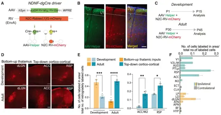 为绘制皮层L1抑制性中间神经元(INs)的单突触神经传入连接图谱,研究人员使用NDNF-dgCre小鼠来标记L1的INs。通过Cre依赖性AAV辅助病毒联合基因修饰的CVS N2c株G糖蛋白缺失的狂犬病毒(N2c-RV),研究发育阶段和成年期投射到L1的INs的上游神经元。研究人员在小鼠出生后第一天(P1)注射AAV辅助病毒和狂犬病毒,并在两周后定量分析L1的INs的上游脑区,发现在发育过程中,L1的INs接收来自外侧膝状体背核(dLGN)的神经投射最为明显。而对于成年期的研究中,小鼠出生后第30天(P30)注射AAV辅助病毒和狂犬病毒,同样2周后分析,结果表明L1的INs接收来自dLGN的神经投射明显减弱,而接收来自前扣带皮层(ACC)、压后部皮层(RSP)和运动前区皮层(M2)的投射明显增加。