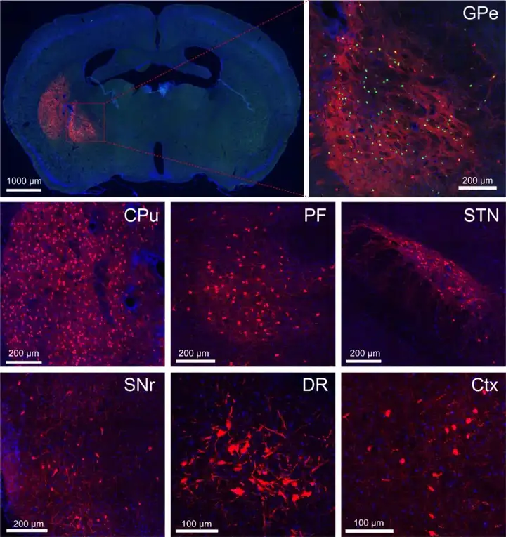 RV-CVS-ENVA-N2C(△G)-tdTomato标记效果图。注射位点为外侧苍白球GPe,对上游脑区进行示踪,逆标区域为尾状壳核CPu,丘脑束旁核PF,丘脑底核STN,黑质网状部SNr,背侧中缝核DR,大脑皮层Ctx。