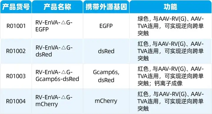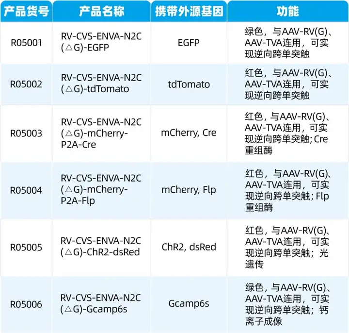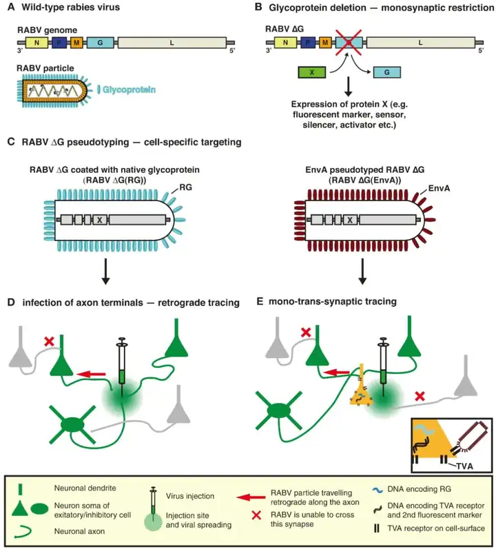 利用禽肉瘤和白血病病毒的包膜糖蛋白(EnvA),其同源受体(TVA)在哺乳动物细胞中不表达。EnvA伪型RABV-△G[RABV-△G(EnvA)]仅感染表达TVA受体的神经元。反式互补RG使RABV-△G能跨一级突触感染特定的突触前神经元。而由于这些突触前细胞中缺乏RG,病毒无法进一步扩散,从而形成跨单突触系统。将编码荧光蛋白基因插入到RABV基因组缺失G的位点以修饰RABV,能使病毒追踪的神经元(跨突触标记神经元)可视化。此外,带有天然糖蛋白外壳的RABV-△G(RG)在轴突末梢被轴突吸收,可作为逆行示踪剂通过标记投射到特定靶区的细胞来推断脑区间的连接。