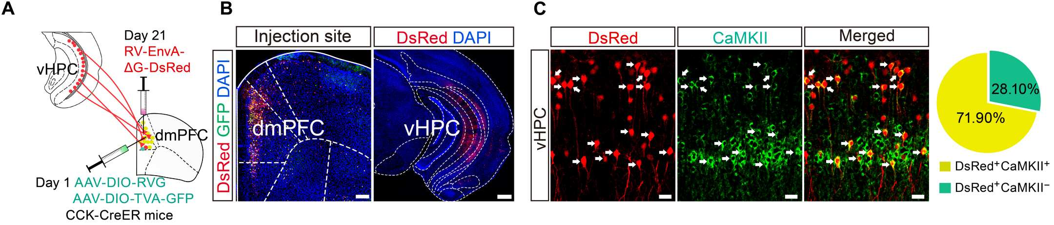 图2. 逆行跨突触示踪鉴定GluvHPC→CCKdmPFC环路