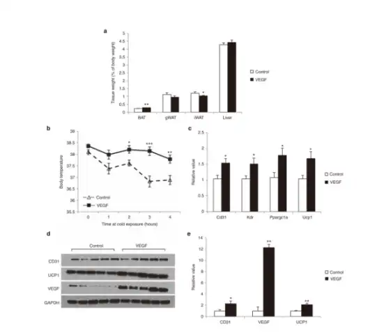 Rec2-VEGF载体导致BAT质量显著增加,皮下WAT减少,体重或食物摄入量无变化。BAT中VEGF的过度表达显著增强了冷暴露时维持体温的能力。Rec2-VEGF使BAT中的VEGF蛋白水平增加了约12倍,另外,CD31和UCP1蛋白质水平加倍。基因表达谱显示参与血管生成和产热的基因上调。