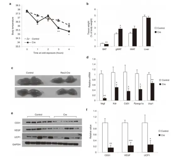 VEGFloxP小鼠口服Rec2-Cre 5周后,Rec2-Cre处理小鼠在4℃条件下4小时内无法适当维持体温,6周后BAT质量显著减少,性腺WAT质量显著增加。WB显示BAT中的VEGF蛋白水平降低了约80%,血管标记物CD31(血小板-内皮细胞粘附分子)和生热标记物UCP1(增温素,属于解偶联蛋白)类似地减少,qPCR显示CD31、UCP1、KDR(编码VEGF受体2)和PPARgC1a(过氧化物酶体增殖物激活受体γ辅激活因子1α,参与产热)表达下调,这与产热功能障碍一致。