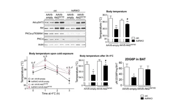 本文结果显示,在β肾.上腺素能刺激下,mTORC2在棕色脂肪细胞中被激活。此外,脂肪组织中特异性缺乏mTORC2的小鼠(脂肪组织中特异性敲除rictor的AdRiKO小鼠)体温过低,表现出对寒冷的敏感性增加,并且冷诱导的葡萄糖摄取和糖酵解受损。将AAV8-CAG-humanAkt2S474D注射到小鼠肩胛间棕色脂肪组织中(过表达活化的Akt2,2E+11 vg/只,每个脂肪小叶注射2次10 μL,使载体在整个脂肪库中分布),结果表示能恢复BAT中葡萄糖摄取,并足以提高AdRiKO小鼠的体温及改善其耐寒性。因此,表明BAT中的mTORC2-Akt(蛋白激酶B)信号介导冷诱导的葡萄糖摄取和糖酵解进而调节BAT葡萄糖代谢,从而维持非颤抖性产热(调节温度稳态)。