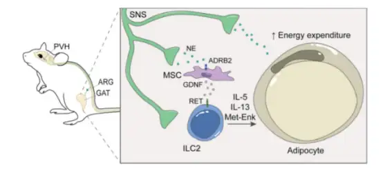 交感主动脉肾-脂肪回路连接到大脑并调节ILC2。GAT神经间充质单位将交感神经信号转化为神经营养因子表达。反过来,神经营养因子通过神经调节受体RET控制脂肪ILC2功能,调控宿主新陈代谢、能量消耗和肥胖。