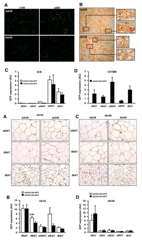 AAV8或AAV9载体的系统递送可转导多种组织。然而,以前从未报道过通过血管内注射这些血清型来转导WAT和BAT。消瘦小鼠尾静脉注射5E+12 vg的AAV8或AAV9-CAG-GFP载体,全身的白色和棕色脂肪库被转导,但不同脂肪库中的转导效率因小鼠品系而异(ICR小鼠与C57Bl/6J小鼠中不同)。重要的是,糖尿病肥胖ob/ob小鼠或db/db小鼠血管内给药AAV8或AAV9载体,也得到了消瘦小鼠中WAT、BAT类似的转导效率。
