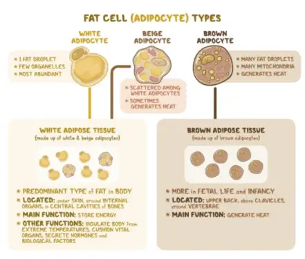 人体或者哺乳动物体内主要存在两种颜色的脂肪组织:棕色脂肪组织(brown adipose tissue,BAT)和白色脂肪组织(white adipose tissue,WAT),相应的,组成这两种组织的细胞分别为棕色脂肪细胞和白色脂肪细胞。成熟脂肪细胞根据形态和功能可以分为白色脂肪细胞、棕色脂肪细胞和米色脂肪细胞三种。白色脂肪细胞以单一的大脂滴形式储存能量,主要机能是将多余的能量以脂滴的方式储存于体内,当能量不足时释放来维持体内代谢的平衡。棕色脂肪细胞包含多个小脂滴和许多线粒体,线粒体是将脂滴转化为热量和能量的“引擎”。主要机能是通过解偶联蛋白(UCP1)来产热。米色脂肪细胞是位于白色脂肪组织中的褐色样脂肪细胞,白色脂肪细胞经过分化得到褐色脂肪细胞的特质,在某些条件下,如冷暴露和刺激特定的神经肾.上腺素受体时,有可能被激活而产生热量。