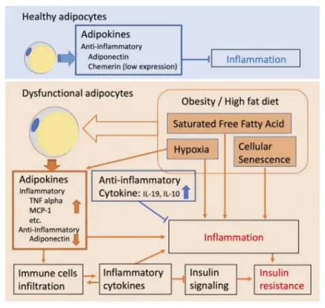 脂肪细胞是一类十分重要的内分泌细胞,能分泌几十种脂肪细胞因子及蛋白质因子,如激素敏感的脂蛋白脂酶、肿瘤坏死因子2α、纤溶酶原激活物抑制因子2、白细胞介素26、IL28、血管紧张素、胰岛素样生长因子2、瘦素、抵抗素、脂联素等,其中有些因子可能与靶细胞胰岛素受体结合,与胰岛素抵抗现象的发生具有密切关系。