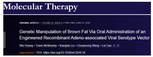 [3]Huang W, McMurphy T, Liu X, et al. Genetic Manipulation of Brown Fat Via Oral Administration of an Engineered Recombinant Adeno-associated Viral Serotype Vector. Mol Ther. 2016 Jun;24(6):1062-1069.