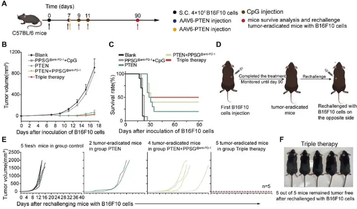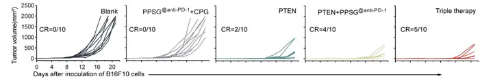 PTEN+PPSG@anti-PD-1+CpG的三联疗法具有协同抗肿瘤免疫效果,引发强大的抗肿瘤免疫作用,在根除恶性肿瘤和抑制肿瘤复发方面前景广阔。
