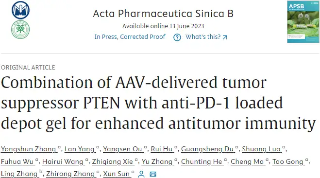 2023年6月13日,四川大学华西药学院孙逊教授团队在Acta Pharmaceutica Sinica B期刊在线发表题为“Combination of AAV-delivered tumor suppressor PTEN with anti-PD-1 loaded depot gel for enhanced antitumor immunity”的研究论文,本文中,作者筛选了一种AAV衣壳,用于将PTEN基因有效递送到小鼠皮肤黑色素瘤细胞(B16F10,肿瘤细胞)中。瘤内注射AAV6-PTEN成功地恢复了肿瘤细胞PTEN基因的表达,并通过诱导肿瘤细胞免疫原性细胞死亡(ICD)和增加免疫细胞浸润来有效抑制肿瘤进展。此外,研究人员开发了一种负载抗PD-1的磷脂基相分离凝胶(PPSG),该凝胶在小鼠体内42天内形成原位储库并可持续释放抗PD-1药物。为有效抑制黑色素瘤的复发,进一步应用基于AAV6-PTEN、PPSG@anti-PD-1和CpG的三联疗法,结果表明这种三联治疗策略增强了协同抗肿瘤免疫效果,还诱导了强大免疫记忆,从而完全抑制了肿瘤复发。总的来说,这种三联疗法可以作为一种新的肿瘤联合疗法,具有更强的免疫激活能力和肿瘤抑制效果。