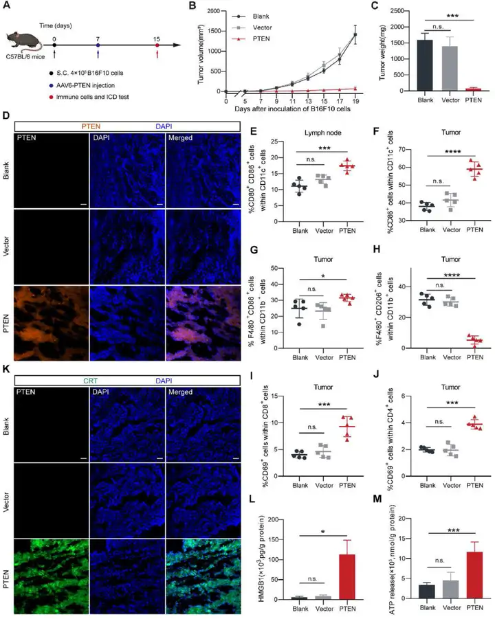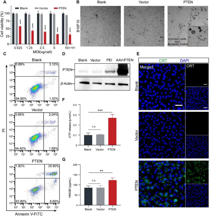 既往研究显示,人癌症细胞中恢复PTEN基因表达可抑制肿瘤生长。研究人员将AAV-PTEN以MOI=1×105感染B16F10细胞48小时,PBS是空白组(Blank)、AAV-PTENR是载体组(Vector),转染试剂PEI和空载的混合物是PEI组,Western blot证实AAV-PTEN有效恢复B16F10细胞中PTEN的表达。随后利用AAV-PTEN以不同MOI感染B16F10细胞48小时,测定细胞活力,结果显示即使在高MOI(1×106)下,AAV-PTENR对B16F10细胞的毒性也可以忽略不计。然而AAV-PTEN组检测到更多的死细胞,IC50为MOI=9.7×104。显微镜下观察B16F10细胞形态,结果显示明显的凋亡现象:细胞萎缩和凋亡小体出现在细胞周围。利用流式细胞术测定细胞凋亡(FITC/PI双染法),结果显示AAV-PTENR组细胞凋亡率没有增加,表明AAV载体没有诱导B16F10细胞凋亡。然而,AAV6-PTEN组显著增加了晚期凋亡细胞。与对照组相比,AAV6-PTEN组凋亡细胞的比例增加了约7倍。表明AAV-PTEN有效促进B16F10细胞的凋亡。前人研究证明PTEN的激活可以促进损伤相关分子模式(DAMPs)的释放并触发免疫原性细胞死亡。表征ICD的三个标志性事件:细胞膜上钙网蛋白CRT的表达;高迁移率族蛋白B1HMGB1和三磷酸腺苷ATP释放到胞外环境。于是,研究人员测定AAV-PTEN处理后B16F10细胞膜上CRT的表达(免疫荧光成像);ELISA检测AAV-PTEN处理后B16F10细胞培养上清液中HMGB1和ATP含量。结果显示,AAV-PTEN组细胞膜上CRT表达显著增加;HMGB1和ATP释放明显增多。综上所述,这些结果表明,AAV6-PTEN诱导细胞凋亡,同时触发ICD。