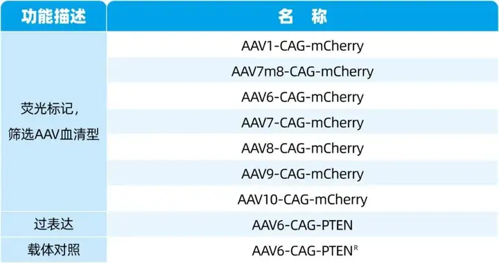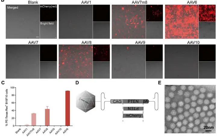 为有效将PTEN基因递送到B16F10细胞中,研究人员筛选AAV的血清型。利用哺乳动物细胞中高表达的CAG启动子调控靶基因mCherry表达,载体为AAV-CAG-mCherry,血清型为AAV1、AAV7m8、AAV6、AAV7、AAV8、AAV9和AAV10。接下来,探究不同血清型的AAV-mCherry感染B16F10的效率,AAV-mCherry以MOI=1×105感染B16F10细胞48小时,mCherry的表达通过荧光确定(共聚焦显微镜成像),随后收集细胞用于流式细胞术分析。结果显示,AAV6可感染91%以上的B16F10细胞,而AAV7m8和AAV8可以感染不超过44%的B16F10细胞。AAV的其他血清型感染B16F10细胞的效率较低。因此,作者选择了血清型6,以有效地递送PTEN基因,包装和纯化AAV6-CAG-PTEN(以下简称AAV-PTEN),并翻转PTEN基因序列和包装AAV6-CAG-PTENR(以下简称AAV-PTENR)作为载体对照。