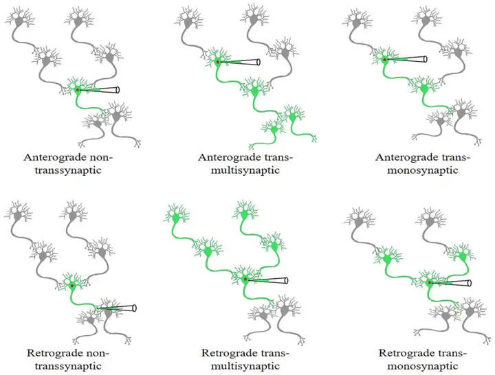 图1. 非跨突触和跨突触(跨多突触或单突触)病毒工具顺行或逆行传递示意图