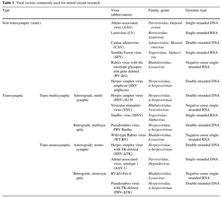 在过去的几十年里,科学家从嗜神经病毒的天然毒株,如伪狂犬病毒(PRV)、单纯疱疹病毒(HSV)、狂犬病毒(RV)、水疱性口炎病毒(VSV)等改造而来诸多病毒工具(即重组嗜神经病毒)。与非病毒示踪剂相比,重组嗜神经病毒具有许多优点:它们能以细胞类型特异性、环路选择性的方式顺行、逆行和跨突触传递。本综述中,作者总结了用于神经环路示踪的病毒工具的研究进展,讨论了在神经科学研究中使用病毒工具的关键原则,并强调了开发和优化病毒工具的创新,进而用于跨不同物种(包括非人灵长类动物)的神经环路追踪。