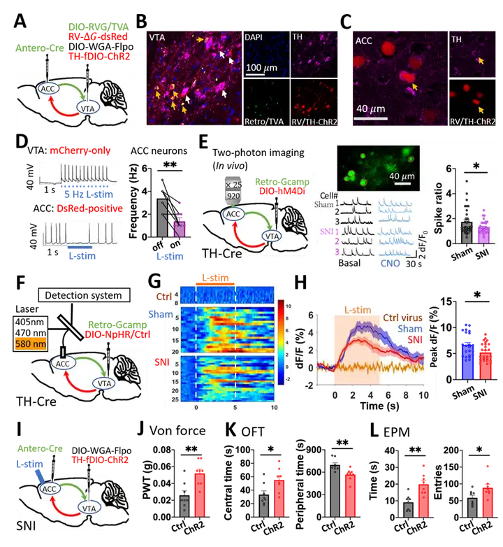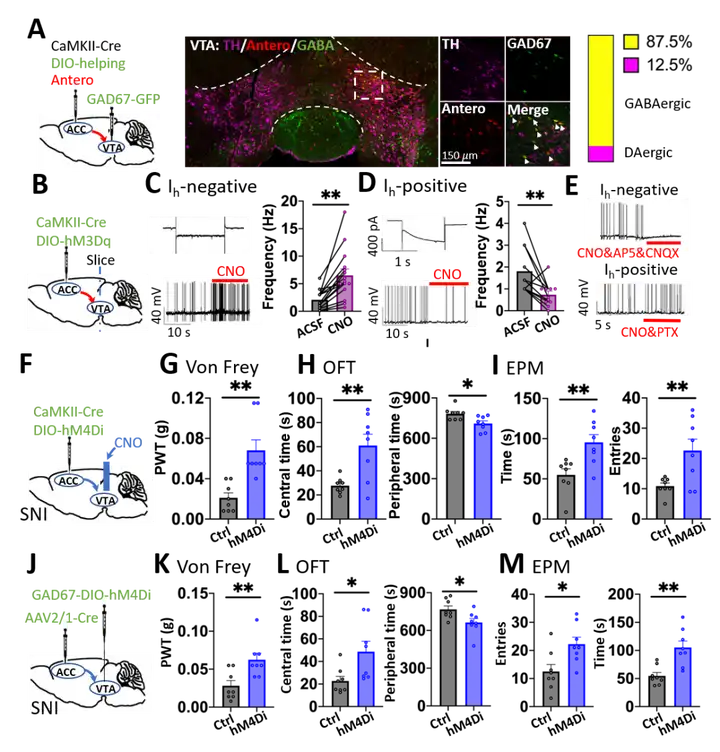 坐骨神经分支损伤(SNI)是一种经典的慢性痛模型,SNI小鼠除痛觉异常外,还会表现出多种负性情绪(焦虑、抑郁、厌恶)反应。作者通过电生理和电化学记录发现,SNI鼠VTADA神经元兴奋性降低、多巴胺分泌减少,化学激活VTADA神经元则能有效缓解慢性痛及其负性情绪改变。病毒示踪结果表明,痛觉信息处理中枢ACCGlu神经元可直接投射到VTA区,结合化学遗传学偶联的电生理记录,作者发现ACCGlu神经元通过兴奋VTAGABA神经元间接抑制VTADA神经元,进而介导慢性痛伴发的负性情绪改变(图1A-E)。相反,通过化学遗传抑制ACCGlu神经元向VTA的投射则能有效缓解慢性痛的痛敏异常及其诱发的负性情绪(图1F-M)。这些结果表明,ACCGlu神经元对VTADA神经元的抑制性调控是介导慢性痛相关负性情绪改变的重要机制。