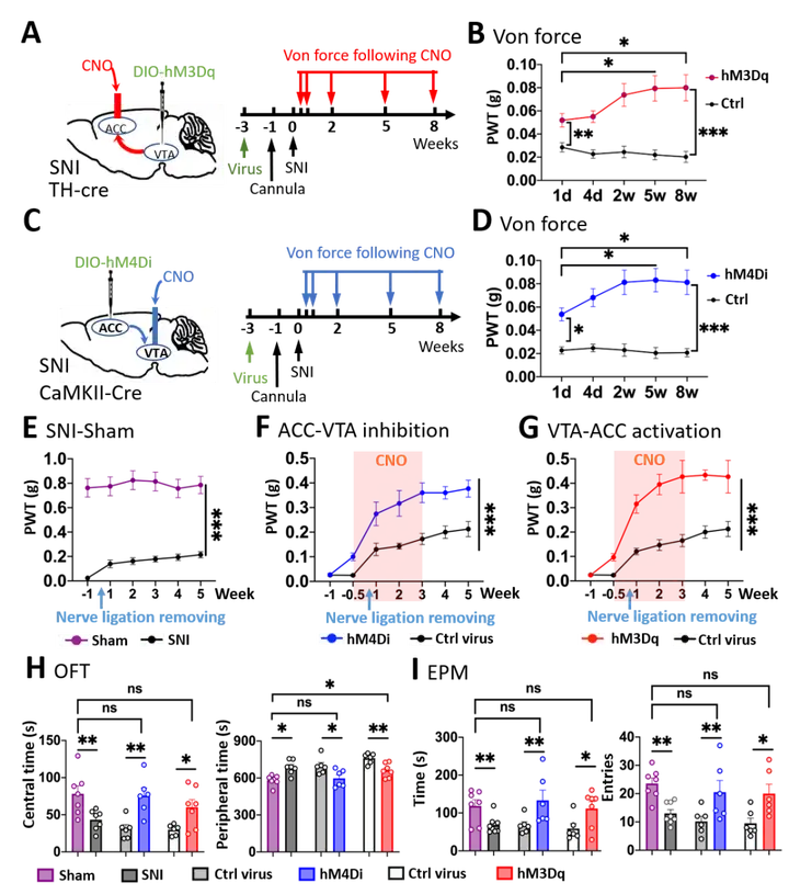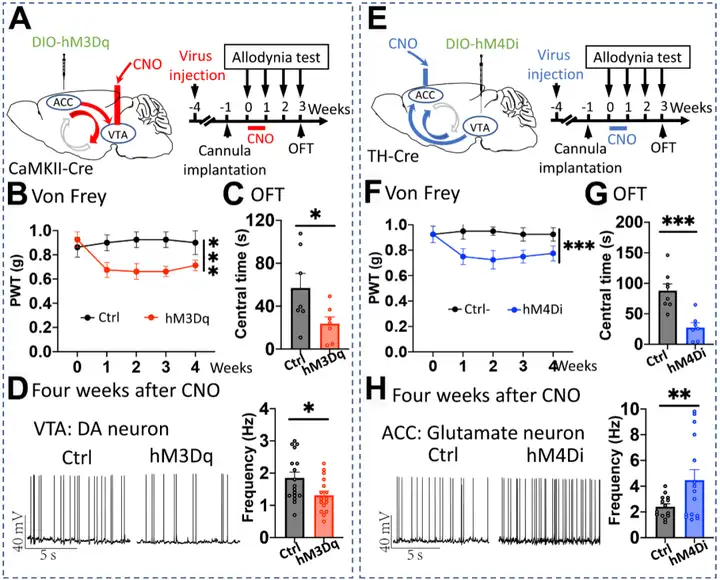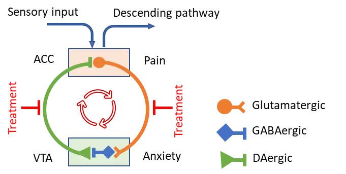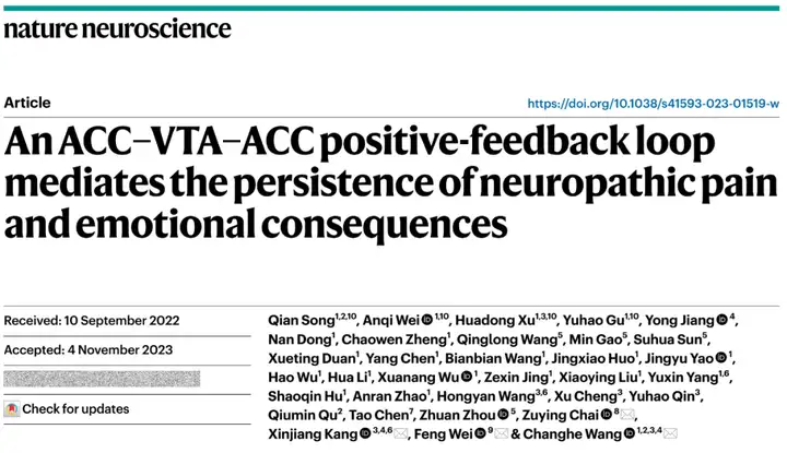 2024年1月3日,西安交通大学王昌河教授团队在Nature Neuroscience上发表了名为“An ACC-VTA-ACC positive-feedback loop mediates the persistence of neuropathic pain and emotional consequences”的研究论文,首次发现痛觉信息处理中枢(前扣带回皮层,ACC)与情感中枢(腹侧被盖区,VTA)之间存在一个重要的正反馈神经闭环,该闭环由ACC谷氨酸能神经元(ACCGlu)、VTA中间GABA能神经元(VTAGABA)和VTA多巴胺能神经元(VTADA)依次连接所构成:ACCGlu神经元通过VTAGABA神经元间接抑制VTADA神经元,进而介导慢性痛伴发的负性情绪改变,同时,VTADA神经元反向投射至ACCGlu神经元介导负性情绪对痛觉异常的反馈调节,即ACCGlu-VTAGABA -VTADA -ACCGlu作为痛觉中枢与情感中枢之间的正反馈神经闭环,不但是痛觉感知与情绪状态交互调控的核心机制,也是慢性痛长期维持和持续进展的重要中枢机制。