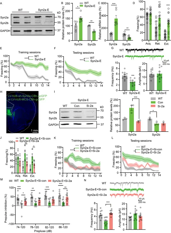 首先,我们用主成分分析(PCA)的办法将40只小鼠的恐惧记忆消退行为学数据进行分析,区分出消退难(Extinction Resistant, EXT-R)小鼠和消退易(Extinction susceptible, EXT-S)小鼠。对消退难易小鼠进行免疫荧光染色及电生理实验,发现难消退小鼠的BLA脑区存在兴奋/抑制(E/I)失衡,并且主要由于IL-BLA中间能神经元的突触前抑制引起的。继续通过Q-PCR、免疫印迹和免疫荧光等实验手段,提示Syn2a蛋白可能与之相关。我们构建了Syn2a过表达(Synapsin 2a elevated, Syn2a-E)转基因小鼠模型,行为学测试中发现Syn2a-E小鼠相比野生型小鼠在恐惧记忆消退方面存在困难。此外,电生理检测显示Syn2a-E小鼠的BLA脑区中间能神经元自发兴奋性突触后电流sEPSCs的频率显著下降,表明Syn2a-E小鼠可以复制EXT-R小鼠中观察到的恐惧记忆消退困难和IL-BLA中间能神经元环路的突触前抑制。通过使用病毒降低Syn2a-E小鼠IL脑区神经元中的Syn2a水平可缩短Syn2a-E小鼠的平均僵直率,恢复了BLA中间神经元sEPSCs的频率。此外,我们使用了基于双病毒的Cre-loxp系统,专门上调IL-BLA中间神经元特定环路中的Syn2a蛋白,同样观察到该小鼠在消退阶段的僵直时间明显增加,BLA中间神经元中sEPSCs的频率显著降低。