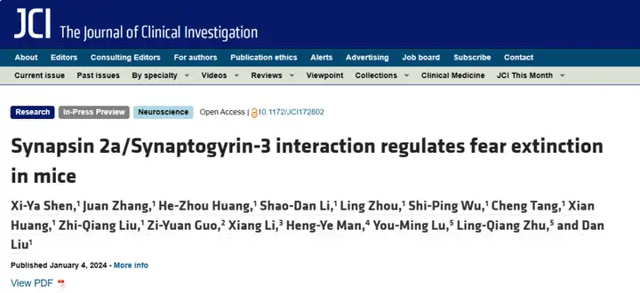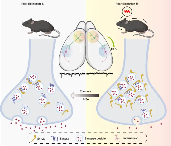 2024年1月4日,华中科技大学同济医学院基础医学院刘丹教授、朱铃强教授团队在Journal of Clinical Investigation杂志上发表名为“Synapsin 2a/Synaptogyrin-3 interaction regulates fear extinction in mice”的研究论文,该研究首次发现上调的突触蛋白Synapsin 2a(Syn2a)可通过其特定的H结构域结合Synaptogyrin-3(Syngr3)中的91-99氨基酸,导致边缘下区IL-基底外侧杏仁核BLA中间能神经元环路的突触前囊泡释放异常,破坏该环路的突触前协调,引起下游BLA脑区的兴奋抑制(E/I)失衡并导致恐惧记忆消退受损。而可透过血脑屏障的小分子多肽以及治疗艾滋病药物利托那韦可阻断Syn2a和Syngr3两者的结合,这有效地改善了恐惧记忆的消退,并为PTSD的治疗提供了新的方向。
