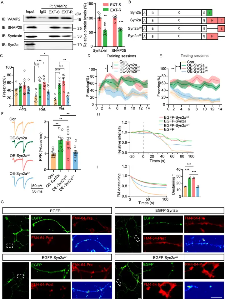 已知Syn2a拥有两个独特的结构域H和E。因此,我们分别构建了两个缺失特定结构域H (Syn2a-△H)或E (Syn2a-△E)的小鼠Syn2a突变质粒并包装为AAV病毒。通过在IL中注射病毒后进行行为学检测,我们发现Syn2a-△H组不会引起恐惧记忆消退缺陷。FM4-64释放实验结果也显示过表达Syn2a和Syn2a-△E组的动力学曲线异常,而EGFP-Syn2a-△H组的动力学曲线正常。以上实验结果均提示了H结构域是Syn2a发挥突触前囊泡释放抑制功能的关键结构域。为了研究Syn2a的结构域H如何与突触囊泡结合,我们进行了GST pull down质谱分析和免疫共沉淀实验,表明Syn2a H结构域与Syngr3的91-99个氨基酸有结合。