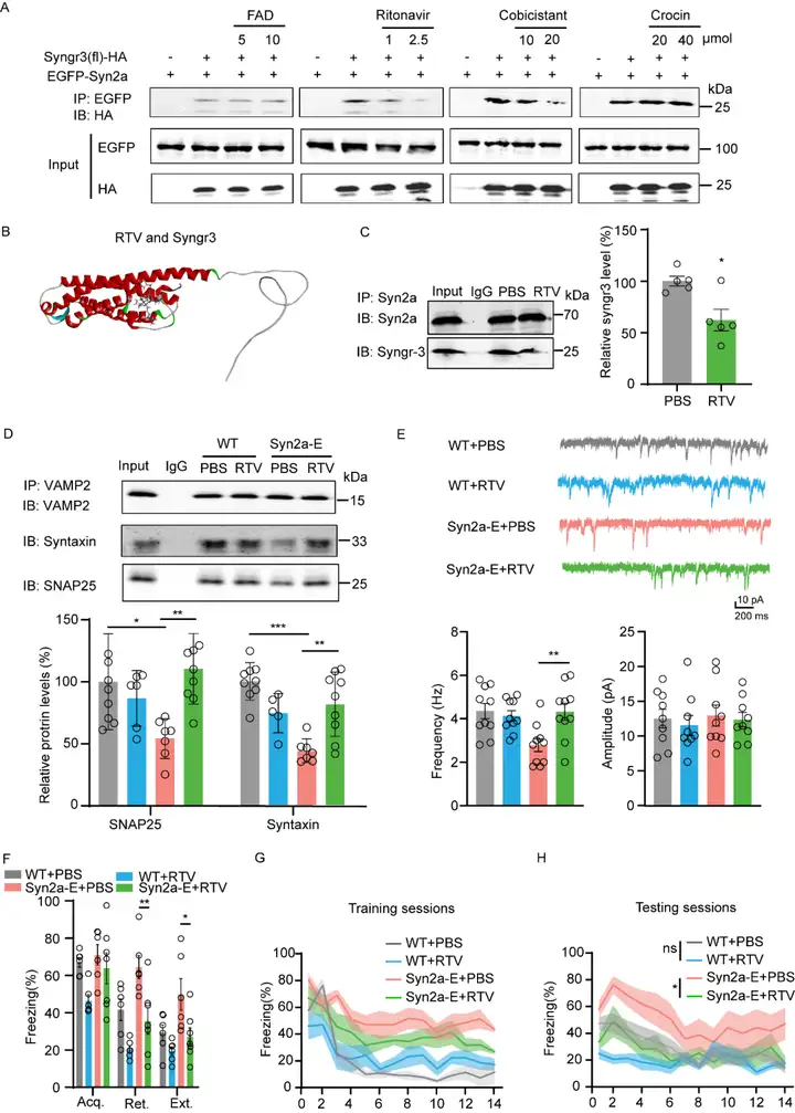接下来,我们用一种小分子多肽和分子对接找到抗艾滋病药物利托那韦,两者均可阻断Syn2a和Syngr3之间的相互作用并挽救Syn2a-E和EXT-R小鼠的恐惧记忆消退受损。