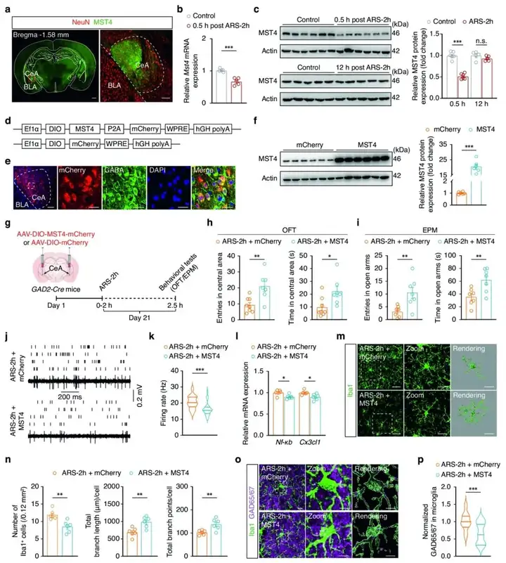 图5. GABACeA神经元中MST4的过度表达缓解了急性应激诱导的焦虑样行为