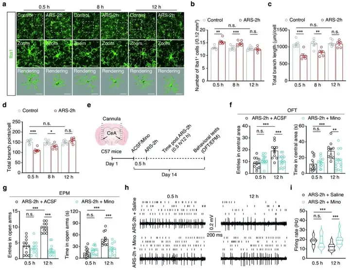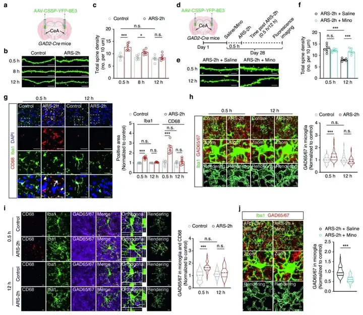 ARS-2h小鼠在应激后0.5 h和8 h,CeA中的小胶质细胞活化,在应激后12 h被逆转。通过颅内注射小胶质细胞抑制剂米诺环素(Minocycline,Mino),作者发现在应激后12 h小鼠焦虑样行为仍然存在,而且神经元活性并未恢复正常。这些结果表明,抑制小胶质细胞活化可阻断应激诱导的GABACeA神经元过度活跃的恢复和焦虑样行为的消失。